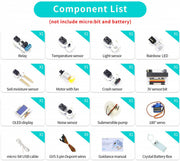 【Compinents】For this microbit kit, we selected executed components commonly used at home as temperature sensor, sound sensor, crash sensor, servo, motor, rainbow LED and more.